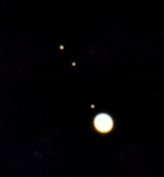 Jupiter: SP26mm Zwei Wolkenbänder gut zu erkennen aber mehr war nicht möglich, dafür Io, Eur, Gan in schönem, regelmässigem Abstand aufgefädelt und einige andere Sterne als Pseudomonde. Höhere Vergrösserungen sinnlos.