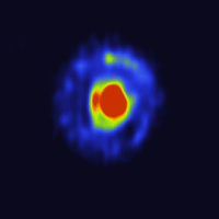 In diesem Falschfarbenbild, das Andreas mit dem Programm IRIS erstellt hat, kommen die Details im Ring - und auch einige in der hellen Kernscheibe - deutlicher heraus. Rot bedeutet hell, blau bedeutet schwach. |