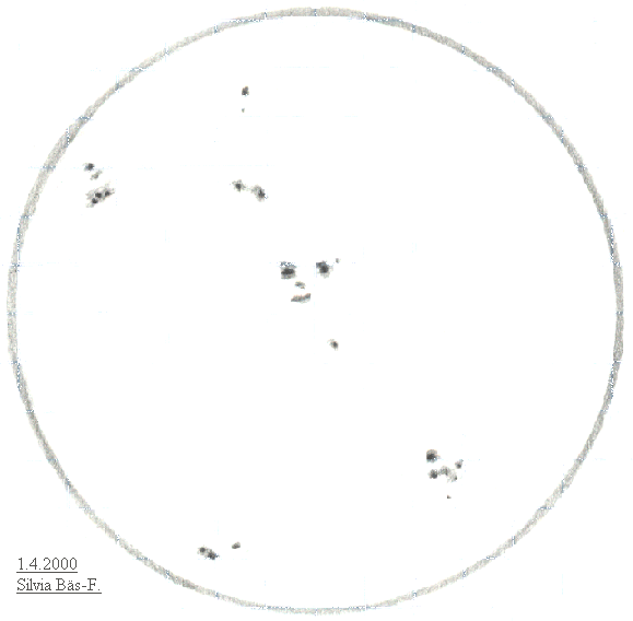 Sonne am 1. April 2000, Skizze. Wolken haben mehr Details verhindert. Ab 15.50 Uhr MESZ war es bedeckt. |