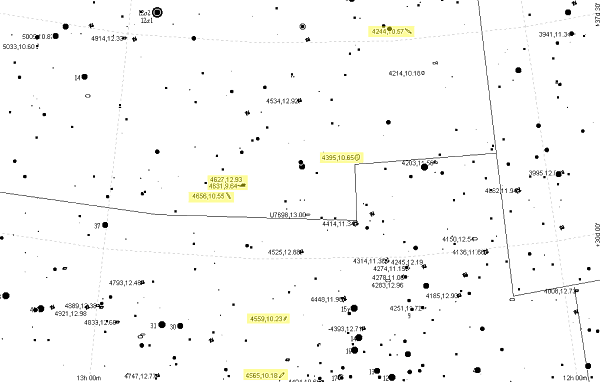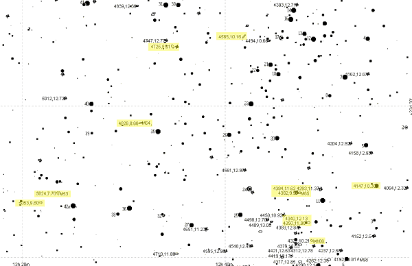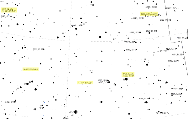 Jetzt sind wir schon tief in der Coma Berenicis. NGC 4725 hat einen sehr hellen Kern und ist eine große ovale Galaxie ohne erkennbare Struktur. Intermezzo: Drei Kugelsternhaufen. M53 ist sehr hell und schön bis ins Zentrum aufgelöst. Sehr gleichmäßig. Ein etwas hellerer und ein gutes Dutzend weniger hellere Sterne heben sich deutlich aus dem Haufen ab. NGC 5053 ist sehr schwierig, nur einige Sterne kommen heraus. NGC 4147 ist klein, sehr dicht, am Rand leicht aufgelöst. Doch weiter mit den Galaxien.