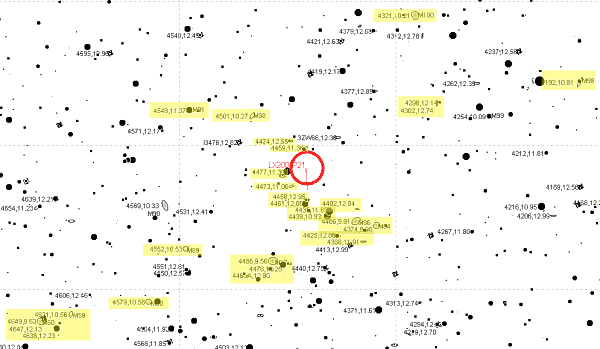 M87, die hellste Galaxie in diesem Gebiet, sowie die beiden Begleiter NGC 4478 und 4486 sind deutlich zu erkennen. M87 ist serh hell mit hellem Kern. Alle drei sind auf einmal im Gesichtsfeld zu erkennen. M59, M60, NGC 4638 und 4647 passen ebenfalls auf einmal in das rund 1/2 Grad große Gesichtsfeld. 4647 ist ganz knapp bei M60. Der Kern von M60 ist diffus und nicht sternartig. 4647 hat eine diffuse Mitte und eine größere diffuse Hülle. M89 sehr heller Kern, kleine Hülle. M58 hat hellen Kern und ist leicht oval. Die Beobachtung in dieser Himmelsregion ist äußerst Batterieschonend, nur kurze Schwenks!