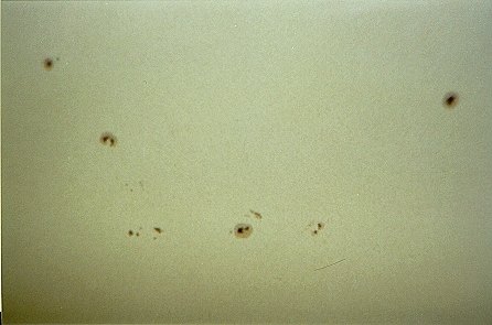 Der Versuch die Sonne mit der Videokamera aufzunehmen schlug fehl. Soll angeblich total einfach sein, man braucht nur die Kamera ans Okular halten, reinzoomen und filmen - Na, keine Ahnung warum, aber bei mir funktionierts nicht. Mehr als ein verwaschener Patzen, der mit der Sonne nichts zu tun hatte, ist es trotz grösster Bemühung nicht geworden. Vielleicht kann mir da jemand von Euch weiterhelfen.