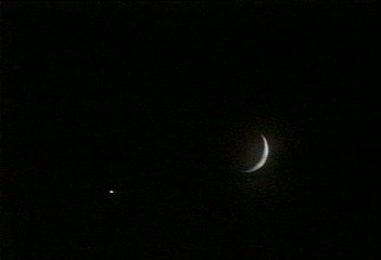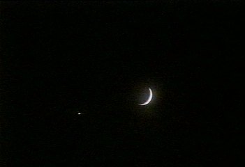 Ein Anruf von Andreas Berthold, und ich eilte zum Südfenster: Prachtvoll stand der dünne zunehmende Mond neben der Venus! Schnell die Videokamera gezückt, ein paar Sekunden aufgenommen und dann digitalisiert: