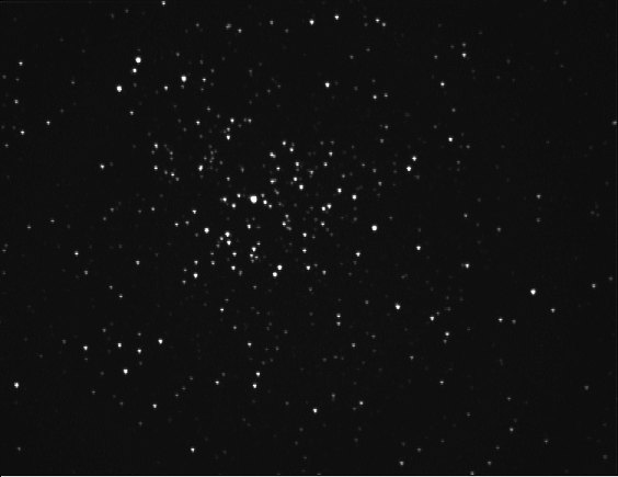 Ich wählte den schnellen HR-Modus und Belichtungszeiten von 30 bis 40 Sekunden; erst ging es ans fokussieren. Der helle Riesenstern in der Mitte des Haufens (TYC2410-1320-1) ist mit 9.1mag hell genug, um mit 5 Sekunden Belichtungszeit zu fokussieren. Mit ein Grund, warum ich dieses Objekt gewählt habe. Eine "Krankheit" von SC-Teleskopen ist nämlich, daß sich beim Schwenken der Fokus verändert, weshalb Fokussieren nur an dem Objekt sehr nahe gelegenen Sternen sinnvoll ist. Beim Fokussieren merke ich Probleme mit dem Seeing. Das Intensitätsmaximum variiert von Aufnahme zu Aufnahme stark, ohne daß ich den Fokussiereknopf betätige. Jetzt zur eigentlichen Aufnahme. Als größter Feind erweist sich der Wind. Ein etwas stärkerer Windstoß garantiert selbst bei f/6.3 eine verhaute Aufnahme. Zum Glück sieht man das Ergebnis sofort! Im fünften Anlauf klappt es dann.