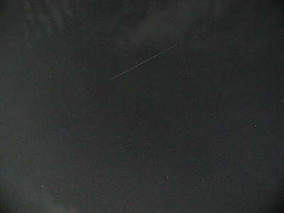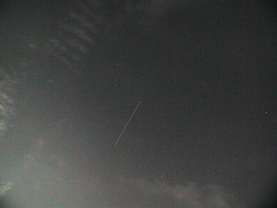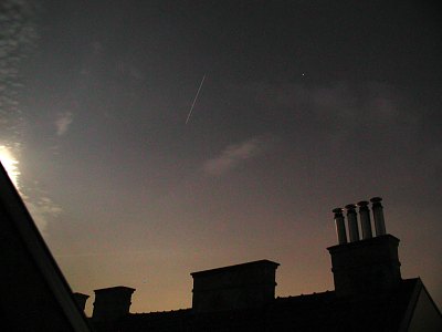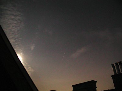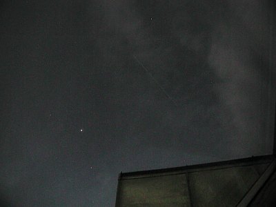 Vielleicht ein allerletzter letzter Blick zur Raumstation MIR? Der Wetterbericht verheißt weiterhin für die nächsten Tage nichts Gutes, auch wenn es heute besser ist als vorhergesagt. Die Sichtbarkeit für Österreich endet am 10. März - Rasch noch ein paar Fotos durch mein Dachfenster! Pünktlich auf die Minute taucht MIR im Nordwesten auf - ein großes Lob an Chris Peat von Heavens-Above.com) und zieht hoch über den Himmel. Wie am Vortag ist sie auffällig schnell und wird so hell wie Jupiter, plus/minus, so gut sich das bei der doch merklichen Bewölkung sagen käßt. Die Aufnahmen wurden mit 10 Sekunden Belichtung bei einem Äquivalent von 100 ASA und einer Brennweite, die 29mm bei einer Kleinbildkamera entspricht, aufgenommen. Rauschen wurde nachträglich entfernt. |