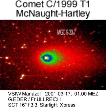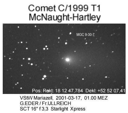 Nach eine "visuellen" Session mit recht tief reichenden Einblicken in Galaxienhaufen im Bereich Leo, Coma und Ursa Major Beobachtung des aktuellen Kometen Mc.Naught-Hartley. Komet deutlich sichtbar, Schweifansatz erkennbar. Einb Bild sagt mehr als tausend Wort - anbei zwei Bildchen von unserm Eindruck. Aufnahmedaten: 40sec Intergrationszeit mit der Starlight Xpress, nicht korrigiert, SCT 16" LX 200, f=3,3