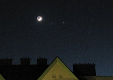 Da konnte ich nicht wiederstehen. Schnell die Digitalkamera aufs Stativ und einmal eine Weitwinkelaufnahme nach Westen. Belichtungszeit 1/2 Sekunde bei einem Äquivalent von 400 ASA. Deutlich erkennt man schon hier das aschgraue Mondlicht. Jupiter steht rechts neben dem Mond und Aldebaran ganz knapp über der Dachkante. |