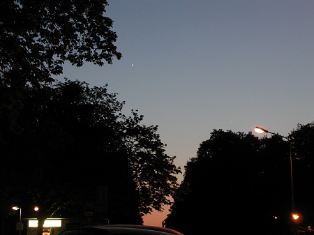 Jupiter (links oben) und Merkur (links neben der Straßenlampe) in der Abenddämmerung des 10. Mai 2001.