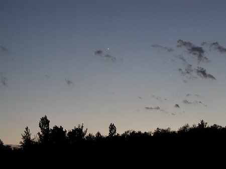 Jupiter (Mitte) und Merkur (rechts unterhalb) in der Abenddämmerung des 11. Mai 2001.