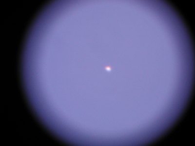 Merkur im Fernrohr, 14mm Pentax-Okular. Das Seeing da unten in den Wolken ist verheerend, kein rhiger Moment, und in dieser besten Aufnahme der Serie kann man die Phase des winzigen Scheibchens auch nur erahnen. Merkur ist durch die Horizontnähe auch zum kleinen Spektrum verzerrt. |