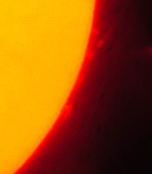 Zuvor "spielte" ich mich noch mit dem Lumicon H-Alpha-Filter an der Sonne, und obwohl diese nur wenige Grad über dem Horizont stand, gelangen mit der ans Okular gehaltenen Digitalkamera ein paar bemerkenswerte Bilder. Allerdings muß man anmerken, daß die Kamera mit dem dunklen monochromatischen Licht doch so ihre Probleme hat ...