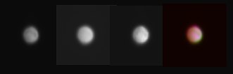 Der Mond geht auf. Nicht hell, nicht rot, sondern fahl und rotgrau. Aha, es liegt starker Dunst in der Luft, darum ist Mars so schwach und braucht die langen Belichtungszeiten ohne Graufilter. Ich blicke zum Himmel. Arcturus, Vega, Altair, Deneb. Mehr nicht. Das soll ein Sternenhimmel sein? Nun gut, es ist noch nahe am Vollmond, aber haben wir in Namibia nicht bei Mondlicht die Milchstraße gesehen? Egal, hier ist's eben anders. Ein Paar ist nach dem Abendessen wiedergekommen und sieht zum ersten Mal den Mars in einem Fernrohr. Sie sind begeistert. Na gut, vielleicht sollte ich auch bescheidener werden. Zuhause geht es ans Auswerten. Die Serien mitteln und durch unscharfe Maske jagen, dann etwas an der Helligkeit drehen und korrelieren; gibt zumindest ein Falschfarbenbild: