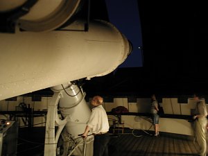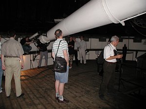 Das Seeing entpuppte sich zunächst als sehr schlecht, wurde aber etwas besser. Vermutlich mußte erst die unter Tags angestaute warme Luft aus der Kuppel durch den breiten Spalt entweichen. Mehr als eine 200-fache Vergrößerung war aber nicht drin. Markus Dewath und ich machten einige schnelle Fotos mit Digitalkameras, Bernhard Dewath blieb seinen klassischen Film treu.