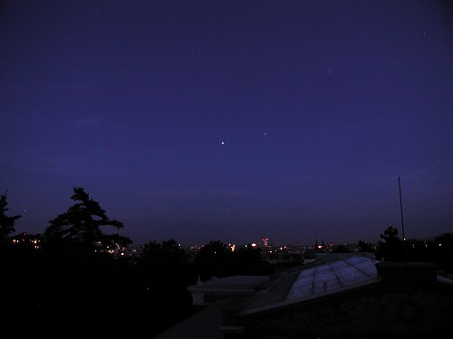 Es grenzt ja in unseren Breiten schon an ein Wunder, wenn das Wetter bei einem im voraus geplanten Beobachtungstermin mitspielt. Diesmal tat es das. Dank dem Entgegenkommen von Dr. Göbel konnten wir nämlich heute wieder einmal die Gelegenheit wahrnehmen, mit Wiens größtem Fernrohr zu beobachten, dem 68cm-Refraktor der Wiener Universitätssternwarte. Unser Ziel, der Planet Mars, stand leider tief im Süden und auch wenn es keine nennenswerten Wolken geben sollte, wie würde das Seeing über der Stadt sein?