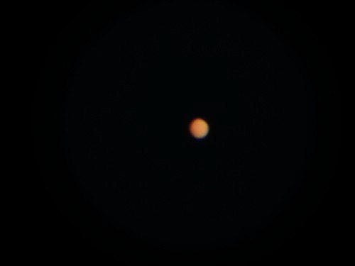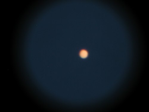 Seltsam war es, daß dies unheimliche, zitternde Ding, das da tief im Süden auftauchte, unser Mars sein sollte, der schöne sanfte Mars, der in Afrika die Nächte su ruhig beleuchtete; aber doch war er es, und im Sternenrohr erschienen auch blickweise seine Polkappe und Wolken. Auf Aufnahmen mit der CCD-Kamera verzichtete ich, bei dem Seeing lohnte sich der Aufwand für den Aufbau nicht. So schoß ich eine Serie von Bildern mit der Digitalkamera durch das Okular, anfänglich das 21mm-, dann das 14mm Pentax-Okular. Die Ergebnisse waren zunächst ernüchternd: