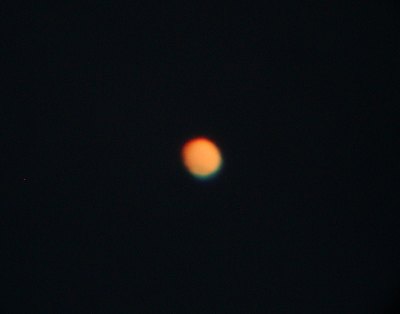 Der Mars zeigt heute sogar ein paar Details. Die nördliche Polkappe und die Phase sind deutlich und mit etwas Phantasie erkennt man auch ein paar dunkle Flecken. Offenbar legt sich der Sandsturm. Das Seeing ist nicht sehr gut, dennoch wage ich heute ein Foto.
