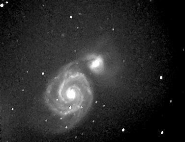 Halt! Bevor sie untergeht - M51! Ich mache eine Aufnahme mit zwei Minuten. Ich erkenne keinerlei Verzerrung durch Bildrotation; die Lage des Objekts ist günstig und ich wage ein Experiment. 3 Minuten? Nein. 4 Minuten? Nein. Ich gehe gleich auf 5 Minuten, die längste Belichtung, die ich bisher mit der MX916 gewagt habe. Das Ergebnis war in der Stille der Nacht nicht zu überhören ...