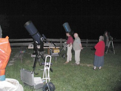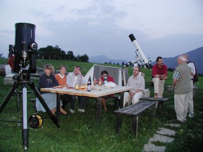 Wir nützen den milden Abend - es ist für hiesige Verhältnisse wirklich sehr warm - für ein Picknick im Freien. Nach dem Aufbauen der Instrumente verspeisen wir die von Anneliese, Doris und Frau Dirnwöber eilig eingekauften Delikatessen inmitten unserer Fernrohre. |
