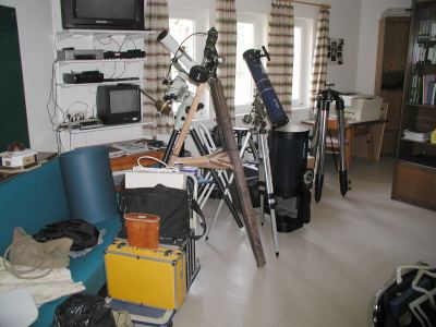 Seminarnachmittag, 18. AugustUnsere Fernrohre verbringen, im Gegensatz zu uns, die wir sehr gut in der Jugendherberge in St. Sebastian untergebracht sind, die Nacht auf der Sternwarte. Dicht gedrängt stehen sie im Seminar- und Aufenthaltsraum. Vor dem Seminar müssen wir sie natürlich noch zur Seite schaffen. |