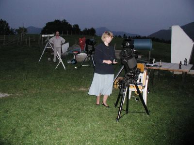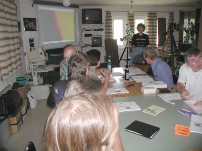 Unser Seminar wird von Anneliese Haika und mir geleitet. Trotz akutem Schlafmangel gelingt es uns, die Teilnehmer wach zu halten. Ob da nicht auch eine gewisse Dosis Kaffee im Spiel war? Ein besonderer Gag: Bilder, die nur Minuten vor Beginn des Seminars draußen am Fernrohr gemacht wurden, werden in das Seminar eingebunden und so gut es geht vor Ort interpretiert. Beinahe schon "live"... |