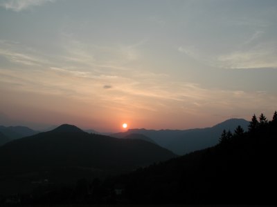 18. August: Um Himmels Willen, es wird wieder schön!Schon am Nachmittag zeichnet es sich ab: Kein Gewitter, keine nennenswerten Wolken. Tiefrot versinkt die Sonne im Westen, diesmal nicht hinter Wolken, sondern hinter den Bergen. Kitschig, aber schön! Wir können uns nicht von der Sternwarte trennen, anstelle ins Tal in ein Gasthaus zu fahren, bestellen wir Pizza; Günther Eder, unser unermüdlicher Gastgeber, spielt Pizza-Bote. Während die Sonne der Abenddämmerung Platz macht, speisen wir erneut im Freien, umringt von unseren Fernrohren, die nur auf die nächste Beobachtungsnacht warten. Wenn bloß wir so viel Energie hätten ... |