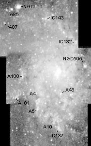 Auch dieses Bild, drei Chipflächen groß, zeigt nur den Kernbereich der riesigen Galaxie, die äußersten Ausläufer fehlen noch immer. Man erkennt zahlreiche Details, darunter HII-Regionen (NGC, IC) und OB- Assoziationen (A), zu identifizieren mit nachfolgender Karte: