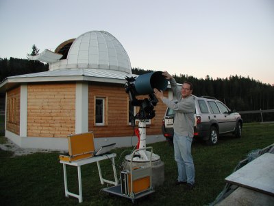 Aber es bot sich eine andere Gelegenheit; Günther hatte mir bei der Eröffnung der Sternwarte ganz stolz eine recht verwaiste Außensäule vor der Sternwarte gezeigt. Ich meinte, mit einem parallaktischen Aufsatz wäre ich jederzeit mit meinem 12" LX-200 dabei. Günther versprach mir den Aufsatz rechtzeitig zu montieren, uns so fuhr ich doch nach Mariazell und ich nützte die Gelegenheit, um mein 12" LX-200 erstmals parallaktisch zu montieren und ohne Bildrotation zu fotografieren.
