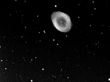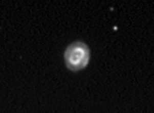 M57, Summe aus 10 Aufnahmen mit je 10 Sekunden Belichtungszeit. Logarithmische Skalierung. Bei 4m Brennweite kommen schon enorm viele Details heraus. |