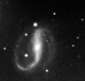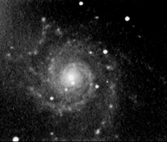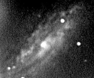 M77 im Cetus, eine Seyfert-Galaxie mit sehr hellem Kern. Belichtung wie oben, zusätzlich logarithmisch skaliert. Eigentlich eines der schönsten Objekte an diesem Abend. |