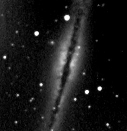 NGC 891 in der Andromeda. Sogar die ist zu groß. Die Kamera im Hochformat nehmen? Im Prinzip ja, aber da müßte ich STAR2000 umkonfigurieren, das wollte ich doch nicht. Summe von 10 x 60 Sekunden. Bildausschnitt. |