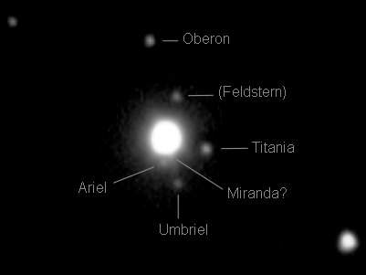 Uranus und seine Monde. Summe aus 10 Aufnahmen zu je 5 Sekunden, logarithmisch skaliert. Monde identifiziert mit StarryNight Pro und dem JPL Solar System Simulator. Bildausschnitt, 3x vergrößert. Uranus ist natürlich überbelichtet, hätte aber ohnedies keine Details gezeigt. |