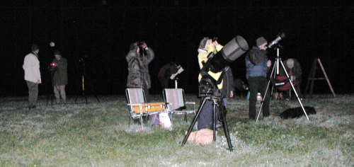 Rund 20 WAA-Mitglieder und Gäste hatten sich mit 12 Instrumenten auf der Sofienalpe eingefunden, um das seltene Schauspiel einer Saturnbedeckung druch den Mond zu beobachten. Auch ich war mit meinem 12" LX-200 dabei. Nach dem routinemäßig schnellen Aufstellen des Instruments dann der Schock: Der Höhenantrieb spinnt! Der Motor fährt langsam, ruckartig, die Nachführung ist äußerst mangelhaft. Ich disponiere daher um und montiere meine CCD-Kamera nicht. Statt dessen mache ich Aufnahmen mit der Digitalkamera durchs Okular, quasi aus der Hand.