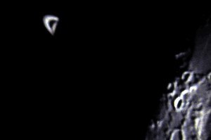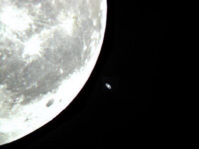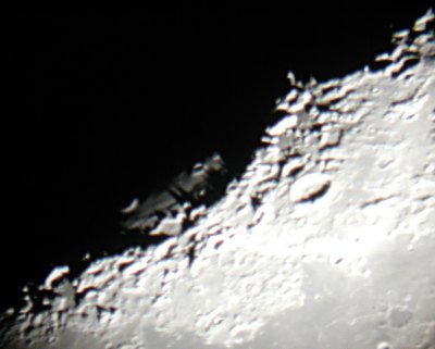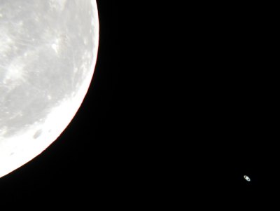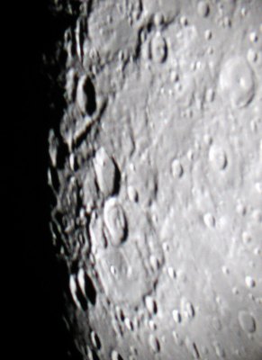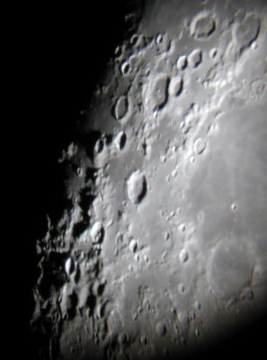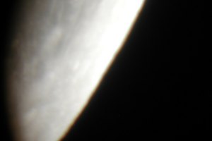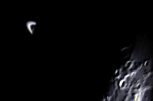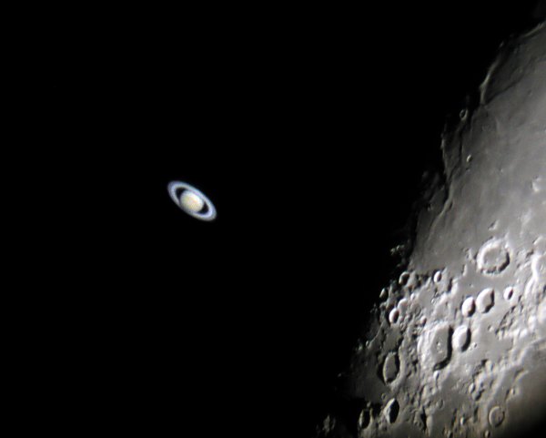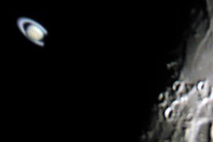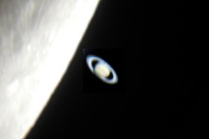 Die nachfolgenden Aufnahmen entstehen alle aus der freien Hand durch das 21mm Pentax-Okular, mit einer Belichtungszeit von 1/10 bis 1/60 Sekunde bei einem Äquivalent von 100 ASA. Saturn kommt einem bei "normaler" Beobachtung recht hell vor, doch neben der noch viel helleren Mondscheibe wirkte er richtig blaß.