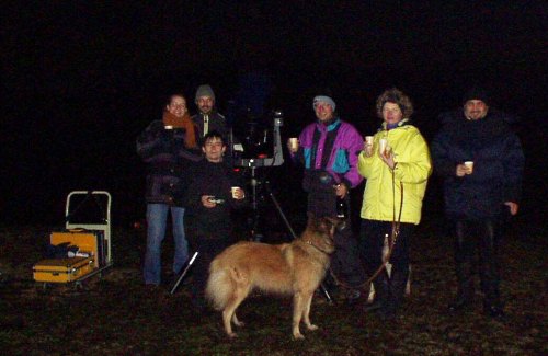 | Bericht: | Um den schönen Abend zu nützen und ein paar Bilder vom Mond und den Planeten zu machen, entschloss ich mich zu einer spontanen Fahrt auf die Sofienalpe, der sich Andreas Berthold und später auch Anneliese Haika (samt Hündin Emba) anschlossen. Für die anderen kam mein Aufruf offenbar doch zu kurzfristig. Groß war die Überraschung, daß wir doch nicht alleine auf der Sofienalpe waren. Ein 6" Newton wurde gerade von zwei Sternguckerinnen aufgebaut, und siehe da, es war ein First Light! Das Instrument war vor kurzem erst erstanden worden und erblickte zu ersten Mal Sternenlicht. Andreas ging rasch hilfreich zur Seite, und so präsentierten wir uns einmal als sehr kompetent. Als ich mit dem Aufbau meines 12" fertig war, gab ich auch gleich eine erste Einschulung im Beobachten. Das Seeing erwies sich leider als lausig. Aber beim Mond, der sehr kurze Belichtungszeiten verträgt, ging es noch einigermaßen. Anschließend verfolgten wir lange eine Jupitermonderscheinung, nämlich den Anfang des Durchgangs von Ganymed vor der Jupiterscheibe. Leider war das Seeing sehr schlecht, dennoch konnte man blickweise den Mond selbst vor der Jupiterscheibe erkennen. Auch ein paar Fotos gelangen, leider sehr undeutlich bei diesen Bedingungen. Dann kamen noch zwei Sterngucker mit einem 8" Newton, noch ein First Light! Da entschloß sich Anneliese spontan, Sekt von der Tankstelle in Hütteldorf zu holen und wir feierten auf der schlammigen Wiese ein doppeltes First Light - und neue Freunde. Letztlich präsentierten wir uns nicht nur als kompetente, sondern vor allem auch als gemütliche Gruppe. Es war ein gelungener Abend. Und was lernen wir daraus: Schlechte Bedingungen müssen nicht die Laune verderben, es kommt ganz darauf an, was man selbst draus macht!