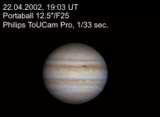 | Instrument: | 12.5" Portaball auf equ. Nachfuehrplattform, Philips ToUcam Pro mit TeleVue Powermate 5x |