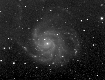 Auf der Aufnahme von NGC 4565 mit einer Gesamtbelichtungszeit von 5 Minuten erkennt man auch die kleine Begleitgalaxie NGC 4562. Und schließlich die Krönung: M101. Die große Galaxie paßt bei dieser Brennweite von etwas mehr als einem Meter genau auf den Chip. Ich mache sehr viele Aufnahmen und das folgende Bild entsteht als Summe von 13 Aufnahmen mit in Summe 12 Minuten Belichtungszeit.