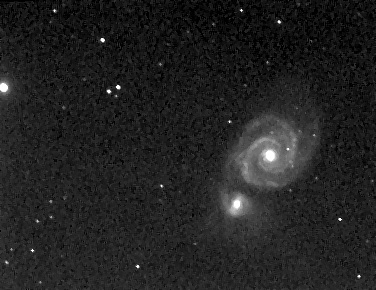 Die beiden Bilder sind hier in 75+er Originagröße wiedergegeben. Jetzt versuche ich mich an Galaxien. Zunächst eine Einzelaufnahme von M51 mit einer Minute Belichtungszeit.