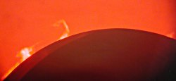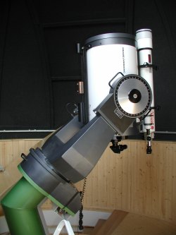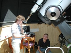 Ausflug zur Vulkanlandsternwarte Auersbach15. August 2002Text: Anneliese Haika. Fotos: Alexander Pikhard. Am 15. August besuchten wir (Alex Pikhard und ich) die Sternwarte des Astroclub Auersbach. Eigentlich hatten wir den Ausflug schon für den vorangegangenen Sonntag geplant, doch das Wetter hatte uns einen sehr dicken Strich durch die Rechnung gemacht. Das Auffinden der Sternwarte war einfacher als befürchtet. Mit Günther Eders guter Erklärung und ein bißchen Glück fanden wir auf kürzestem Weg zur "Vulkanlandsternwarte". Das Heurigenlokal "Zum Sterngucker" gleich unterhalb der Sternwarte kann man nur weiterempfehlen. Wir genossen ein gutes Mittagessen mit einem schönen Blick über die Weinberge. Um 14.00 Uhr trafen wir dann Hannes Schmidt, den Obmann des Vereins. Er zeigte uns den perfekt ausgestatteten Vortragsraum, den der Verein in dem Heurigenlokal hat. Dann ging es in die Sternwarte, in die seit meinem Besuch im Vorjahr noch ein kleiner Beobachterraum im Untergeschoß eingebaut worden war. Das Wetter war aufgelockert, doch zunächst reichte es noch nicht zum Sonne Schauen. Nach zwei "Schlechtwetterobjekten" - der Riegersburg und einem Windrad - konnten wir aber doch die Sonne im Teleskop beobachten. Ein recht hübscher Sonnenfleck bestätigte wieder einmal, daß die Sonne noch lange nicht vor hat, ins Minimum zu gehen. Die Sensation bot aber ein Blick durch den Protuberanzenansatz. Wir sahen einige spektakuläre Protuberanzen, bei denen man in kurzer Zeit schon Veränderungen wahrnehmen konnte. Nach etwa zwei Stunden machten wir uns auf dem Heimweg nach Wien. Ein Dank an Hannes Schmid für die nette Führung! |