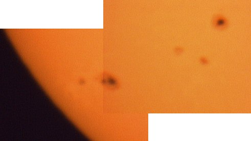 | Bericht: | An diesem sehr warmen Sonntagmorgen probiere ich einmal die Philips ToUCam Pro an der Sonne aus. Der Spektralbereich des Objektivfilters ist für die Kamera, vor allem mit IR-Sperrfilter, kein Problem. Ohne den Filter ergibt sich fast schon ein leichter H-Alpha-Effekt, aber die Farben sind Fantasieprodukte. Allerdings passt bei 3m Brennweite gerade einmal ein einziger Fleck auf den Chip, und das ist erstens sehr wenig und zweitens kommt bei dem schlechten Seeing heute kein brauchbares Bild heraus. Also verkürze ich auf F/6.3; immer noch F=1890mm, aber besser. Leider gehen die Flecken im Seeing recht unter, aber es ist ein Anfang. Belichtungszeit je nach Wolken zwischen 1/500s und 1/1000s.