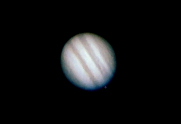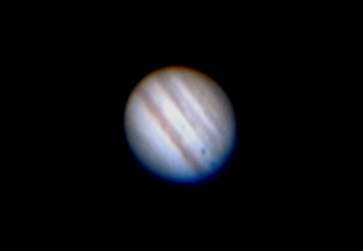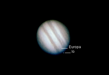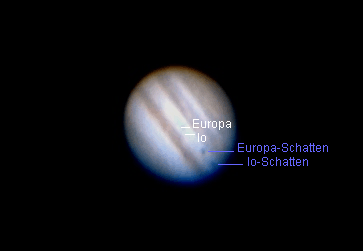 Auch visuell war Saturn beeindruckend und wurde lange bestaunt, auch von zwei nächtlichen Spaziergängern, die sich nicht scheuten, sich zu unserer im Dunkeln hantierenden Gruppe zu gesellen. Jetzt aber zu Jupiter. Sehr schön, zwei Monde, ... Was, nur zwei??? Während Peter Scherz visuell beobachtet und nach seinem Himmelsjahr kramt, mache ich ein erstes Video mit der WebCam. Ein dunkler Punkt? Wahrscheinlich ein Schatten ... Wird die Auswertung bzw. die visuelle Beobachtung ja zeigen. Der Punkt scheint zu springen, manchmal taucht er an einer ganz anderen Stelle auf; na ja, ich beachte den Bildschirm nicht sehr genau, nehme ein sehr langes Video von Jupiter auf, 775 Frames. Dann schalten wir auf Visuell um. Im 21mm Pentax-Okular erkennt Anneliese ganz klar: Zwei Schatten! Jetzt ist auch das Himmelsjahr zur Hand, und ja, Io und Europa sind gleichzeitig vor dem Planeten und auch ihre Schatten wandern gleichzeitig über Jupiter. Das müßte ich doch auf dem Video haben ...