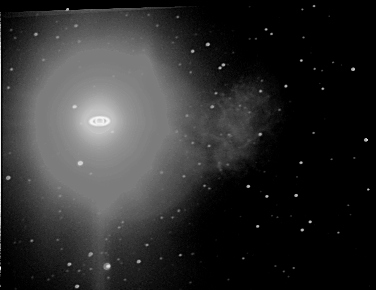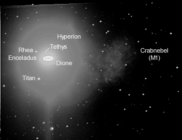 Aufziehende Wolken lassen uns schnell noch einmal zum Saturn schwenken, der heute nahe bei M1 steht. Das ist ein Fall für die StarlightXpress MX916. Ich nehme durch das LX-200 eine Sequenz von 15 Bildern zu je 20 Sekunden Belichtungszeit auf (5 davon sind sehr gut und zeigen schon im Rohbild den Crabnebel), weiters einige Aufnahmen zu nur 0,04 Sekunden Belichtungszeit (!), sie zeigen Saturn, wenn auch sehr klein, mit den hellsten Monden und der Cassini-Teilung. Der Rest ist Arbeit in der digitalen Dunkelkammer ... Nur mit Filtern und Bildarithmetik, ohne auch nur ein Pixel zu verändern oder einen Verlauffilter anzuwenden, gilt es, das alles auf einmal sichtbar zu machen. Rund zwei Stunden Arbeit, aber dann ...