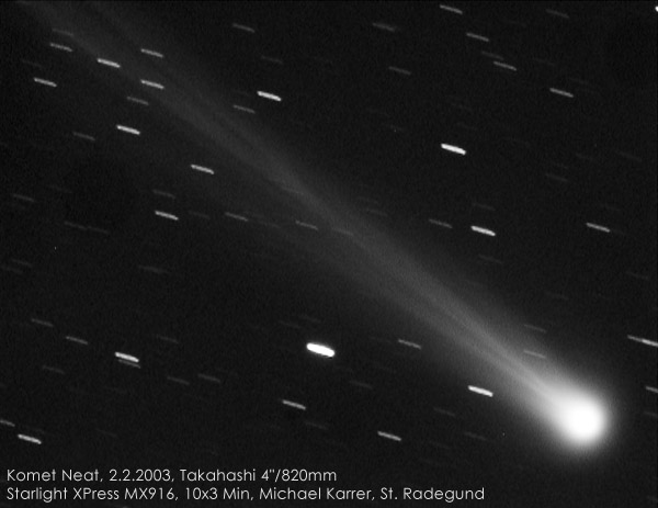 | Bericht: | hallo, gestern konnte ich zum ersten mal diesen kometen aufnehmen. durch dunst bedingt war die durchsicht bescheiden. visuell im 11x80 bino war ein rund 0.5 grad langer, schwacher schweif sichtbar (entspricht etwa dem ausschnitt der CCD aufnahme). mfg michael karrer mkarrer@gmx.at