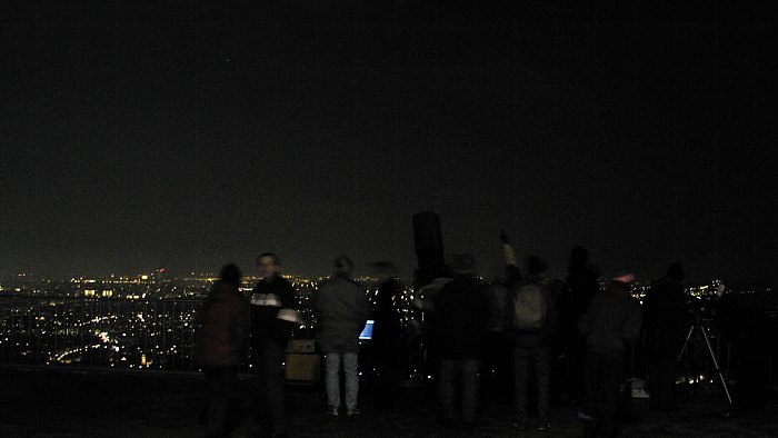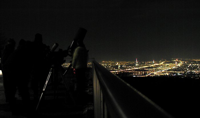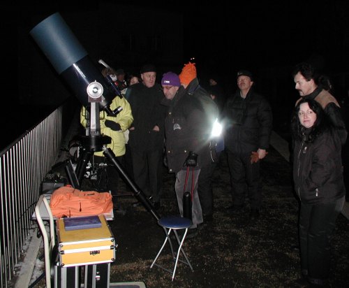 | Bericht: | Samstag, 8. Februar. Ein typischer Sternabend-Samstag. Alle paar Minuten ein Blick zum Himmel. Grau. Mal heller, mal dunkler. Ein paar Schneeflocken fallen. Schade, denn noch nie war die Ankündigung für diese Veranstaltung so gut; am Vortag gleich zweimal im Fernsehen, zu extrem guter Sendezeit. Wäre nicht zu bezahlen gewesen, grosser Dank am ORF-Wien! Aber jetzt ... Zu Mittag wird es merklich heller. Ein erstes Telefonat mit Michael, wir beschliessen, abzuwarten. Es wird wirklich heller. 14.30 Uhr. Es ist sehr dunkel. Michael und ich wollen die Sache abblasen, Anneliese bereitet schon die Absage im Internet vor. Ich blicke nach Norden und sehe -- blaue Streifen am Himmel! Wir verschieben die Entscheidung auf 16 Uhr. 15.45 Uhr. Der Kahlenberg liegt in der Sonne. Wir geben ein GO! Rasch die ganze Ausrüstung einladen. Auf der Fahrt auf den Kahlenberg klart es immer mehr auf. 17.15 Uhr. Aufbau unter fast wolkenlosem Himmel. Die ersten Besucher kommen auch schon. Die Werbung im ORF hat voll eingeschlagen. Es könnte ein Erlebnis werden - es wird ein Erlebnis! Endlich einmal haben wir das Wetterglück auf unserer Seite! Ich bin mit dem Aufbau des 12" LX-200 fertig. Diesmal ist alles dran: Computer, WebCam, StarlightXpress CCD. Positive Überraschung: Ich probiere erstmals aus, mit StarryNight Pro 4.0 anstatt mit TheSky zu steuern, und es klappt ohne Konfiguration auf Anhieb. Plug & Play bei Astro-Equipment, dank des neuen ASCOM Standard! Michael baut seinen exotischen Schiefspiegler auf, Artur einen kleinen, feinen Apochromaten, Peter und Hanne kleinere Newtons, da gibt's keinen Stau. Es wird ein perfekter Sternabend. Ein paar Impressionen von diesem schönen Abend vorab: Der Mond ist natürlich das Hauptobjekt. Zunächst bei schawacher, dann bei starker Vergrößerung. Da kommt Staunen auf. Wie klein mögen die kleinsten Details sein? Nun, ein größerer Wohnblock wäre schon zu sehen! Eine tolle Attraktion wird dann ein "Mondflug" mit der WebCam: So lassen sich alle Formationen gut erklären, und das Seeing ist so gut, dass selbst feinste Rillen auf dem Bildschirm zu erkennen sind. Saturn wird ebenfalls zum vielbestaunten Objekt. Heute erscheint er im Fernrohr so scharf wie mit einem spitzen Bleistift gezeichnet. Doch jetzt heisst es einmal, nach Westen zu schwenken. Dank Starry Night bewegt sich das LX-200 an jene Stelle, wo am Bildschirm schon das etwas zu optimistische Bild eines Kometen mit rund 20° langem Schweif zu sehen ist. C/2002 V1 (NEAT) ist das Ziel. Und da ist er schon. Schon im 8x50 Sucher ein diffuser Fleck mit kurzem Schweif. Im Fernrohr, bei 50mm Plössl, ein heller Scheinwerfer im Nebel mit deutlichem Schweifansatz, ich schätze ihn auf 4,5mag. So einen hellen Kometen hatter wir schon lange nicht! Keine Frage: Dieser Anblick geht hat nur mit einem starken Fernrohr. Im Feldstecher ist der Komet leider nur schwach auzumachen. Gerald Rhemann hat ihn tags zuvor aus dem dunklen Südburgenland mit freiem Auge gesehen. Wir können auf die Tage um den 17. Februar am Morgenhimmel wirklich gespannt sein! Ich möchte den Schweif des Kometen mit der CCD-Kamera und einem 135mm Tele sichtbar machen. Doch das klappt nicht; ich habe zu wenig Strom. Der rasche Aufbruch erfolgte mit nicht genügend stark aufgeladener Batterie und ich hatte einfach zu wenig Saft für LX-200, Computer und CCD-Kamera. Michael hilft mir zwar mit einem zweiten Gel-Akku aus, aber es reicht nicht. Es muss wohl doch ein Generator für solche Aktivitäten her ... Nächstes Objekt ist Jupiter. Wir beobachten, wie sich zwei Monde (Io und Europa) nach gegenseitiger Bedeckung wieder rasch voneinander entfernen. Und später ist auch der Große Rote Fleck ganz deutlich zu sehen. Dann zeigen wir noch, wie wunderschön der Orionnebel ist und wie gut der Anblick erst wird, wenn man das Stadtlicht wegfiltert. Dann sind auch feine Ausläufer gut zu erkennen. Als dann doch wieder Wolken aufziehen, haben wir alle Objekte gezeigt, die wir versprochen hatten, und es ist ein gelungener Sternabend geworden, und ich glaube, wir haben wieder ein paar neue Freunde gewonnen. Hoffentlich klappt es das nächste Mal wieder! | ||||||||||||||||||||||