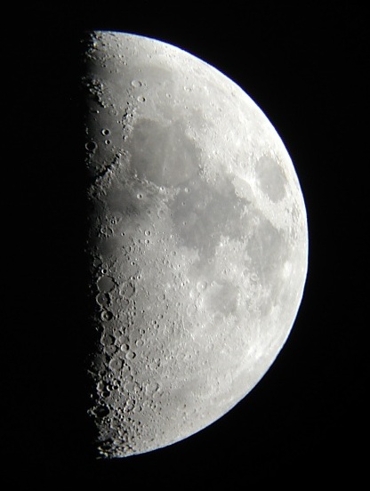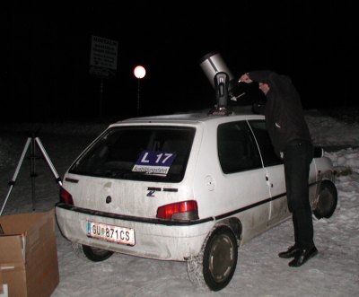 Es klingt wie ein Hohn: Radio Wien spricht von wolkenlosem Himmel und sternklarer Nacht; die sollten einmal nach oben schauen! Denn der zähe Hochnebel läßt immer seltener den Himmel durchblitzen. Na, immerhin ein Blick zum Mond geht sich aus; das Seeing ist sehr gut, die Mondphase die beste überhaupt, und ich kann wenigstens demonstrieren, wie man mit einer Digitalkamera schnell einen Schnappschuss vom Mond einfängt: Die Stimmung ist zwar recht gut, wir tragen es mit Fassung, doch nach einer guten Stunde Ausharren in der Kälte geben doch auf. Der Anruf aus Mariazell, Günther Eders Schilderungen von traumhaftem Seeing und feinsten Strukturen auf dem Mond, waren auch kein richtiger Trost. Na ja, jeden Tag kann man auch nicht so ein Glück haben wir am Vortag ... | ||||||||||||||||||||||