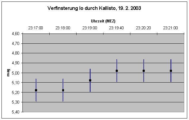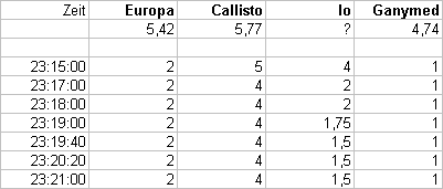Wieder einmal steht eine interessante gegenseitige Verfinsterung zweier Jupitermonde ins Haus. Ich hatte an dem Abend schon einen vergeblichen Versuch, denn die Bedeckung von Io durch Callisto ließ sich nicht wirklich beobachten, zumindest nicht durchs geschlossene Wohnzimmerfenster. Ich hatte mich in der Ephemeride verschaut und die Bedeckung mit der Verfinsterung verwechselt, die ich jetzt beobachten möchte. Peinlich. Für solche Erscheinungen habe ich mir ein hochtransportables, kleines Fernrohr zurecht gelegt, denn der Aufwand, mitten in der Nacht den schweren Zwölfzöller für ein paar Minuten herum zu schleppen ist mir doch zu hoch. Und die Jupitermonde sind hell genug. Knapp nach 23 Uhr begebe ich mich also doch unter freien Himmel, und was ist das? Wolken! Schweinerei, sollte es wie am Vortag wieder knapp am Wetter scheitern? Doch Jupiter kann sich gegen den aufziehenden Hochnebel durchsetzen. Leider verliere ich wegen einer dichteren Nebelschwade den Beginn der Erscheinung. Als ich beobachten kann, ist Io schon merklich verfinstert, nur etwas heller als Callisto, aber deutlich schwächer als Europa und Ganymed. Ich wende das Argelandersche Stufenschätzverfahren an, messe im Kopf die Helligkeiten der Monde auf einer fiktiven Skala; eine erste Messung um 23:15 Uhr fällt den schlechten Bedingungen zum Opfer, doch dann geht es sehr gut. Hier zunächst einmal die Schätzungen: Mir ist der Helligkeitsanstieg von Io am Ende der Verfinsterung sehr deutlich vorgekommen, subjektiv hätte ich gesagt, fast eine Größenklasse. Doch zum Glück habe ich mittels der Argelander-Methode gearbeitet. Rasch noch ein Blick zum abnehmenden Mond - sehr schön - und dann ab nach Hause. Die Beobachtungsdaten stehen auf der Kassette meines Diktiergeräts. Am nächsten Tag geht es ans Auswerten; die erste Messung ist wirklich ein Mist, doch die anderen Schätzungen zeigen eine konstante Genauigkeit von 0,2mag. Nicht schlecht, dafür, dass ich das schon lange nicht gemacht habe und so ein kleines Rohr mir nur 25-facher Vergößerung verwendet habe. Die Auswertung ergibt ein überraschendes Bild: Die Helligkeit von Io war nur um 0,2mag abgefallen, was sich mit Wolfgang Vollmanns Beobachtung voll deckt. Interessant, ich habe den Anstieg als sehr deutlich empfunden. Es geht halt nichts über geübte Wahrnehmung! Hier die Lichtkurve: Ich habe eigentlich bewußt das kleine Rohr gewählt, ohne Nachführung, auf einem nicht allzu stabilen Fotostativ, um zu zeigen, daß man gegenseitige Jupitermonderscheinungen auch mit Fernrohren in der 150 Euro-Klasse gut beobachten kann. Das Ergebnis ist zufriedenstellend. Fazit: Freuen wir uns auf die nächsten derartigen Erscheinungen! | ||||||||||||||||||||||