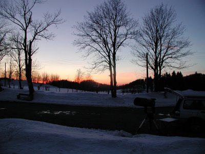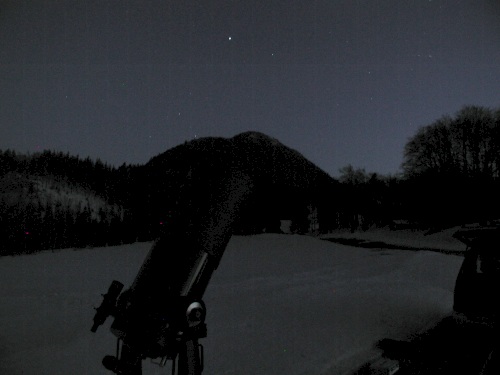 Schnee.![]() Aufbau in der Dämmerung; ich wundere mich, dass niemand da ist. Im Lauf der Dämmerung kommt dann noch ein Astrofotograf aus Wien und ein Beobachter aus Gänserndorf mit seiner Tochter. Ansonsten ist es ruhig; ungewöhnlich, für eine solche Nacht und einen Samstag. Ob das kalte Wetter die meisten abgeschreckt hat? Oder die Aussicht auf Wind? Es ist windstill, und so bemerken wir nicht, dass die Temperatur, anfangs -4°C, im Lauf der Nacht auf -10°C fällt. ![]() Der Große Hund über der winterlichen Ebenwaldhöhe Das erste Objekt ist Jupiter. Ein Blick durchs 50mm Okular: Hoppla, das sind zu viele! Fein nebeneinander aufgefädelt stehen - sechs Lichtpunktchen! Da haben sich wohl zwei Hintergrundsterne dazwischen geschwindelt. Ja, Jupiter steht in einer sehr sternreichen Gegend, nahe der Praesepe. Mit freiem Auge ein bemerkenswerter Anblick, als ob Jupiter einen diffusen Reflex am Himmel hätte. Im 14mm Pentax zeigt Jupiter, nachdem der Tubus einigermassen ausgekühlt ist, schöne Details. Eine deutliche weisse Einbuchtung im NEB und einige dunklen Knoten im NEB und SEB sind bemerkenswert. Ich zücke die WebCam und mache drei Videos vom Jupiter mit jeweils 1/50s Belichtungszeit. Am nächsten Tag fällt mir die Auswahl schwer, welches Bild ich veröffentlichen soll. Alle drei sind sehr gut geworden. ![]() Nächstes Objekt natürlich Saturn. Er ist von zahlreichen Monden umgeben und zeigt viele Details; die Schatten sind alle sehr deutlich, auch der C-Ring kommt heraus, blickweise sogar die Encke-Teilung. Tolles Seeing bei so einer Transparenz! Jetzt sollte ich ein größeres Instrument haben! Auch hier kommt die WebCam zum Einsatz, mit 1/25s Belichtung, da Saturn ja doch merklich schwächer ist als Jupiter. ![]() Auf dem Bild kommt ein Sturmgebiet südlich des EB, nahe dem rechten Rand, deutlich heraus! Doch jetzt, da der Himmel dunkel ist, bleibt nur mehr eines übrig: Visuelle Deep-Sky-Beobachtung. Schon bald wird klar, dass bei diesen Bedingungen die Klassiker im Vordergrund stehen; aber auch ein paar Exoten sollten heute drin sein. Es beginnt im Orion. Der große Orionnebel (M42) ist einfach eine Wucht. Scharf und deutlich abgestuft, grünlich schimmernd, füllt er das Gesichtsfeld des 40mm Pentax und es ist schwer, ihn mit Worten zu beschreiben. Da ist einmal der helle Zentralbereich um das Trapez. Dann, abgestuft, ein etwas schwächerer Bereich mit den ersten Filamenten, die bis zum Rand des Gesichtsfelds laufen. Und dann noch die Außenbereiche, mit den zweiten, schwächeren Filamenten, sie füllen den Rest des Gesichtsfelds und schließen auch M43 ein. Heute ist kein Filter notwendig! Die Milchstraße ist sehr deutlich und im Bereich Einhorn und nördlich von Sirius erkenne ich freisichtig sogar Strukturen - erstmals in der Wintermilchstraße! Ich blicke zum Kleinen Wagen und mache den Test der Aktion "Wie viele Sterne sehen wir noch?": 5mag kein Problem, 6mag ohne Anstrengung, ja, da sind die kleinen Grüppchen: 7mag! Es ist so weit - es ist eine 7mag-Nacht!!! Ich bleibe noch etwas im Orion und nehme mir den Flammennebel NGC 2024 vor. Bei indirektem Sehen sind die dunklen Filamente extrem detailreich, ich kann mich nicht erinnern, den Nebel schon einmal so detailliert gesehen zu haben, auch nicht in größeren Instrumenten. Nach einem Abstecher bei M78 wage ich es, die Bedingungen genau abzuklopfen und stelle den Pferdekopfnebel ein. Ja, es ist eine tolle Nacht: IC 434, der schwache, längliche Emissionsnebel, in den B33 eingebettet liegt, ist ohne Probleme zu erkennen, und damit kommt auch der berühnte Dunkelnebel heute so deutlich heraus wie noch nie. Schon ohne Filter erkenne ich ihn, ein UHC-Filter macht die Sache deutlicher. Die beiden kleinen Reflexionsnebel NGC 2023 und IC 435 sind sehr hell. Eine bemerkenswerte Region! Sehr hell sind auch die Reflexionsnebel um NGC 1977, in denen die charakteristischen Dunkelwolken sehr schön herauskommen. Mit dem 14mm Pentax wage ich mich dann noch zu NGC 1999 und kann die kleine dunkle Stelle in dem Reflexionsnebel gut erkennen. Leider steht Orion schon tief und geht im Lauf der Nacht unter; der Himmel wird dominiert von den Frühlingssternbildern, im Nordosten kommen sogar schon die Sommersternbilder herauf. Ich beginne mit ein paar Schwerpunkt-Beobachtungen, unterbrochen von kurzen Pausen mit heißem Tee. Südliche Objekte: Jetzt ist die Zeit, tief stehende Objekte im Bereich der Wasserschlange und Umgebung zu sehen. Ich beginne im Achterschiff, bzw. jenem Teil davon, den man bei uns gut sehen kann. Hier gibt es interessante offene Sternhaufen. M93 ist sehr dicht und konzentriert, aus schwächeren Sternen, aber ein sehr schöner Anblic (21mm Pentax). M47 hat sehr helle Sterne und ist locker, und M46 ist wegen des eingebetteten planetarischen Nebels NGC 2438 bemerkenswert. Der Nebel zeigt sich heute als deutlicher Ring, der nicht so gleichmäßig geformt ist wie der Ringnebel in der Leier, sondern an einer Stelle merklich verdickt ist. Ein wunderschönes Objekt! NGC 3242 in der Wasserschlange ist ein schöner planetarischer Nebel. Er wird "Jupiters Geist" genannt, und das zurecht; er ist oval und etwa so groß wie Jupiter, zeigt keinen Zentralstern und ist recht homogen gefüllt, ohne nennenswerte Strukturen. Ganz anders geartet ist NGC 4361 im Raben; dieser große planetarische Nebel hat einen hellen Zentralstern und zeigt eine große, ovale, diffus auslaufende Hülle. In der Nähe ein Blick zum Kugelsternhaufen M68; obwohl er sehr tief steht, ist er gut bis zur Mitte hin aufzulösen und etwas kleiner als M92. Und noch zwei Objekte in dieser Gegend sind hervorzuheben: Zum einen die Antennengalaxien NGC 4038/39; sie sind heute sehr deutlich, ihre beiden nierenförmigen Körper sind in ihrer Form deutlich zu erkennen und bei indirektem Sehen erkennt man auch einige helle Knoten in ihnen, die charakteristischen HII-Gebiete. Die Antennen selbst sind nicht zu sehen; nur blickweise glaubt man, ein schwaches Filament zu seh