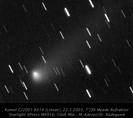 | Bericht: | hallo astrofreunde, trotz druchschnittlicher sichtbedingungen (mag. 4,5 freisichtig) versuchte ich mich unlängst an kometen: 1) komet RX14 überraschte mich, denn den gut 10' langen, breiten diffusen schweif hätte ich bei einem objekt dieser größenordnung nicht erwartet. autoguiding am kometenkopf.