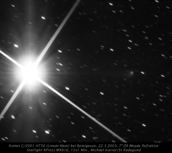 2) komet HT50 kontrastierte als winzling zur hellen beteigeuze. (um den sternenklechs ästhetischer darzustellen setzte ich ein kreuz vor die optik.)