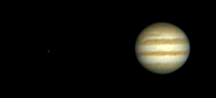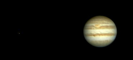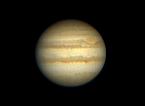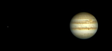 Die Videosequenzen wurden mit 1/33s gemacht, 200 - 300 Bilder. Arthur Heinz und ich liefern einander einen richtigen Wettbewerb um das beste Jupiter-Video, Arthur ist mit seinem C8 zunächst im Vorteil, was das Seeing anbelangt. Doch mein 12" kühlt aus, und am wohltemperierten SCT wird Jupiter mehr und mehr zum Erlebnis. Visuell kommt viel heraus - wenn auch nicht so viel wie bei Franz Zwanzgers Refraktor mit dem "Fliegengitter"! Arthur borgt mir seine 2x-Barlow-Linse; meine 3x-Linse ist zu stark. Aber jetzt gehts los. Rasch noch ein paar Staubkörner in die Ecken des Kamerachips geblasen, und dann folgen ein paar Videos mit 6m Brennweite. Wow, das kann sich sehen lassen. Und hier das Ergebnis von ca. 400 Bildern zu je 1/25 Sekunde: