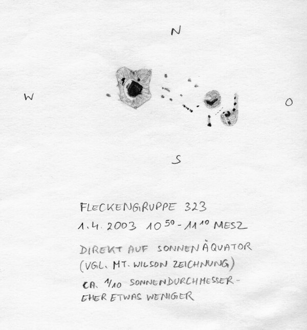 | Bericht: | Der herrlich klare, blaue Himmel lockt zum Sonne Beobachten. Nach einem Blick auf die aktuelle Sonne im Internet (http://www.spaceweather.com/) konnte ich sicher sein, daß sich die Beobachtung auch lohnen würde. Die Sonne zeigt heute mindestens sechs Fleckengruppen, die schön in zwei Reihen entlang des Äquators aufgefädelt sind. Eine Gruppe (Nr. 323) ist besonders ausgedehnt und reizte mich zum Zeichnen. Nach langer Zeit entstand so wieder einmal eine Skizze einer Sonnenfleckengruppe. Die Gruppe ist langegezogen und erstreckt sich ziemlich genau entlang des Sonnenäquators mit dem "Hauptfleck" im Westen.